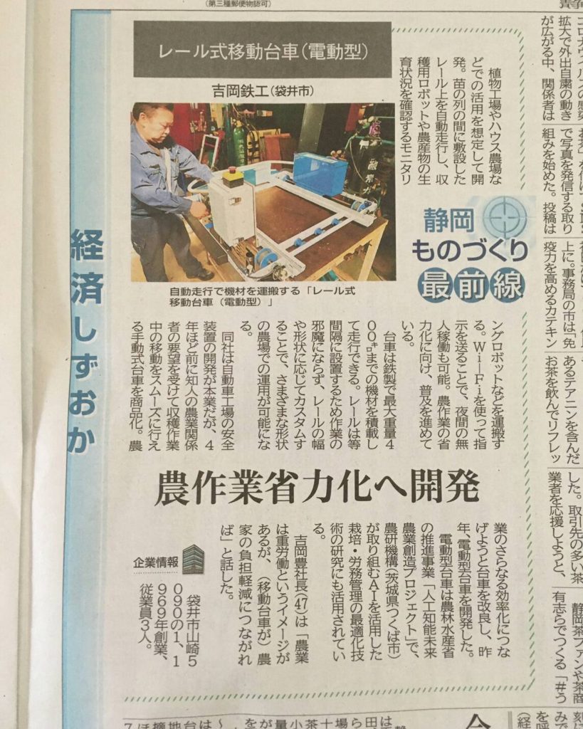 2020年5月1日 / 最終更新日時 : 2020年5月1日 shim お知らせ 静岡新聞に掲載されました 2020年5月1日付の静岡新聞朝刊に、弊社の移動式レール台車の記事が掲載されました。 おかげさまで多くの皆さまから反響をいただきました。 今後ともよろしくお願い申し上げます。 FacebookXBlueskyCopy